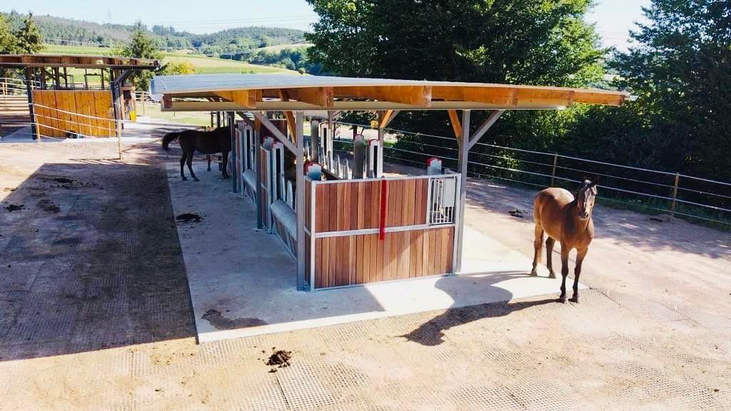 Im Gegensatz zur klassischen Boxenhaltung leben die Pferde in einer offen gestalteten Gruppenhaltung mit verschiedenen Funktionsbereichen: